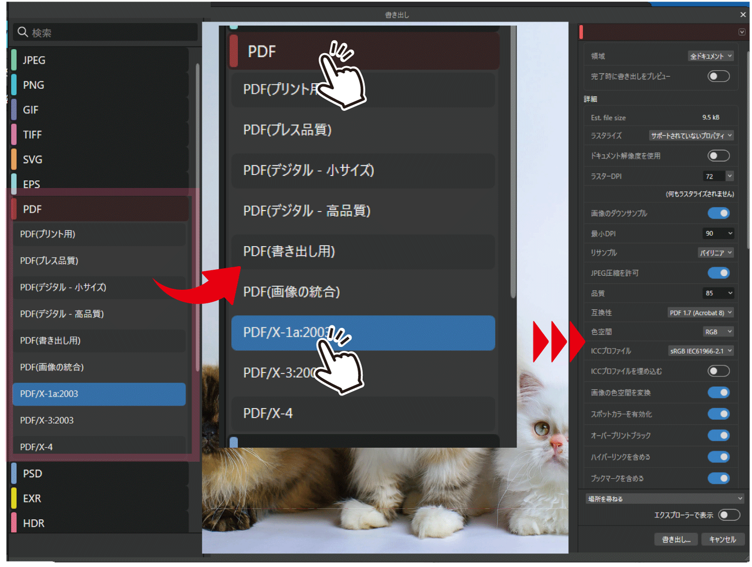 ファイル形式を「PDF/X-1a 2003」に設定する