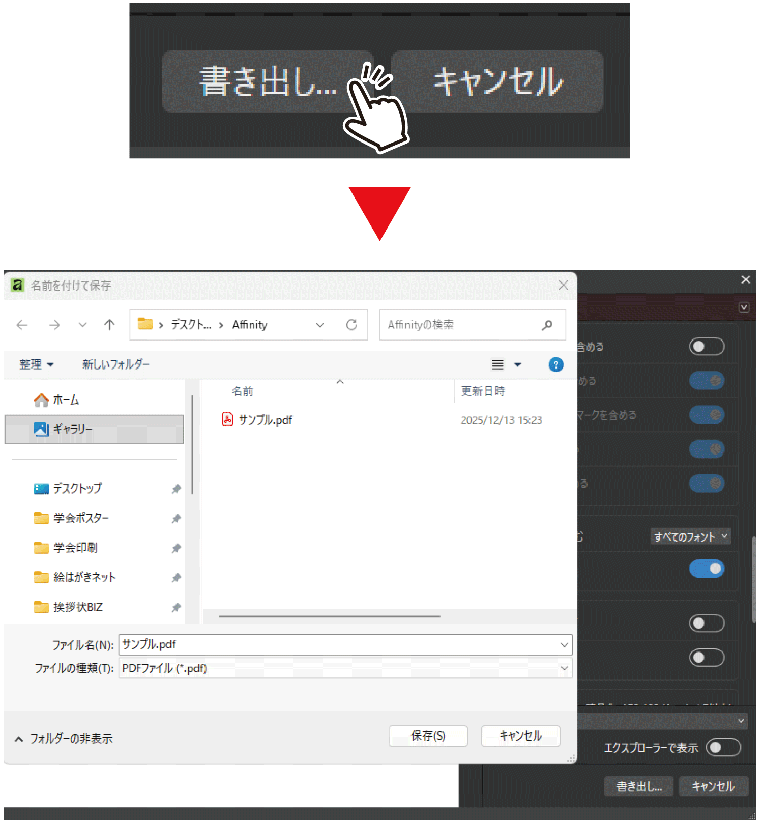 Affinityの保存形式(.af)でのご入稿は受け付けしていませんので、ご注意ください。