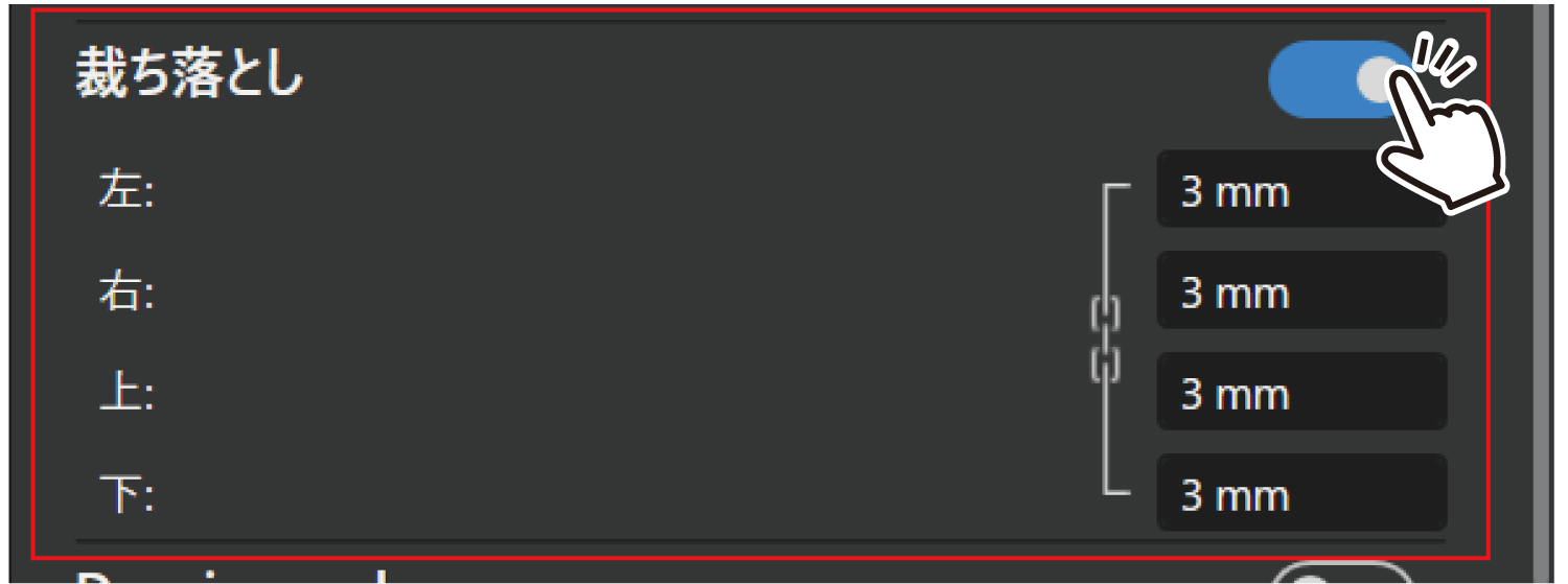 ※ 塗り足しは、別途「ブリード(塗り足し)」項目で設定します。