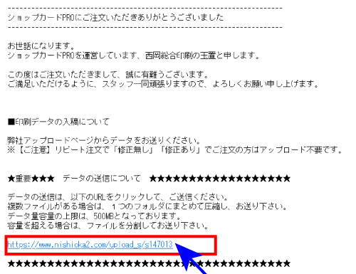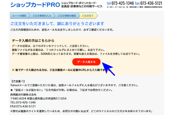 ご注文完了画面と注文確認メールからデータ送信フォームに移動できます。