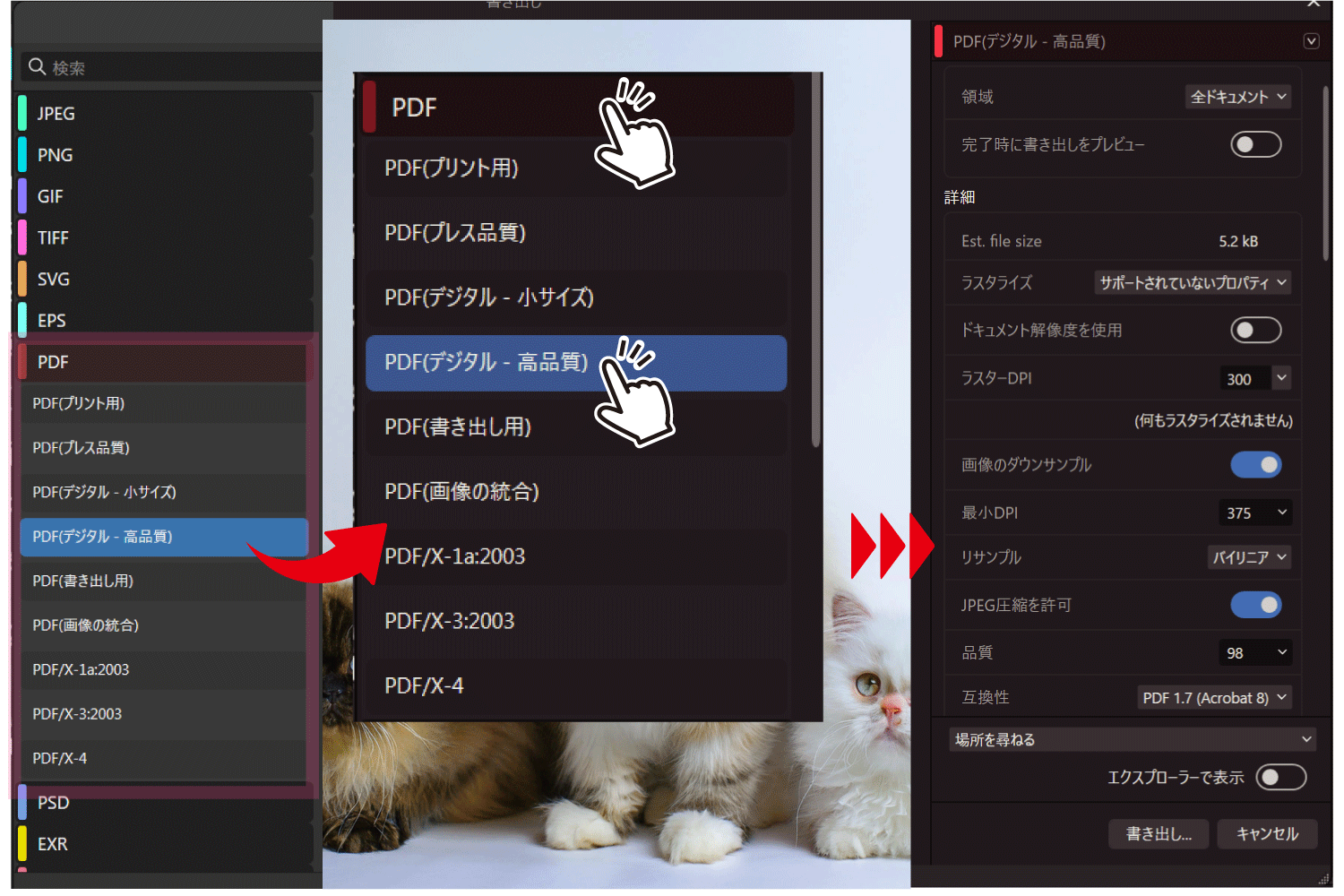 PDFの保存形式一覧が表示されますので、「PDF(デジタル・高品質)」を選択してください。