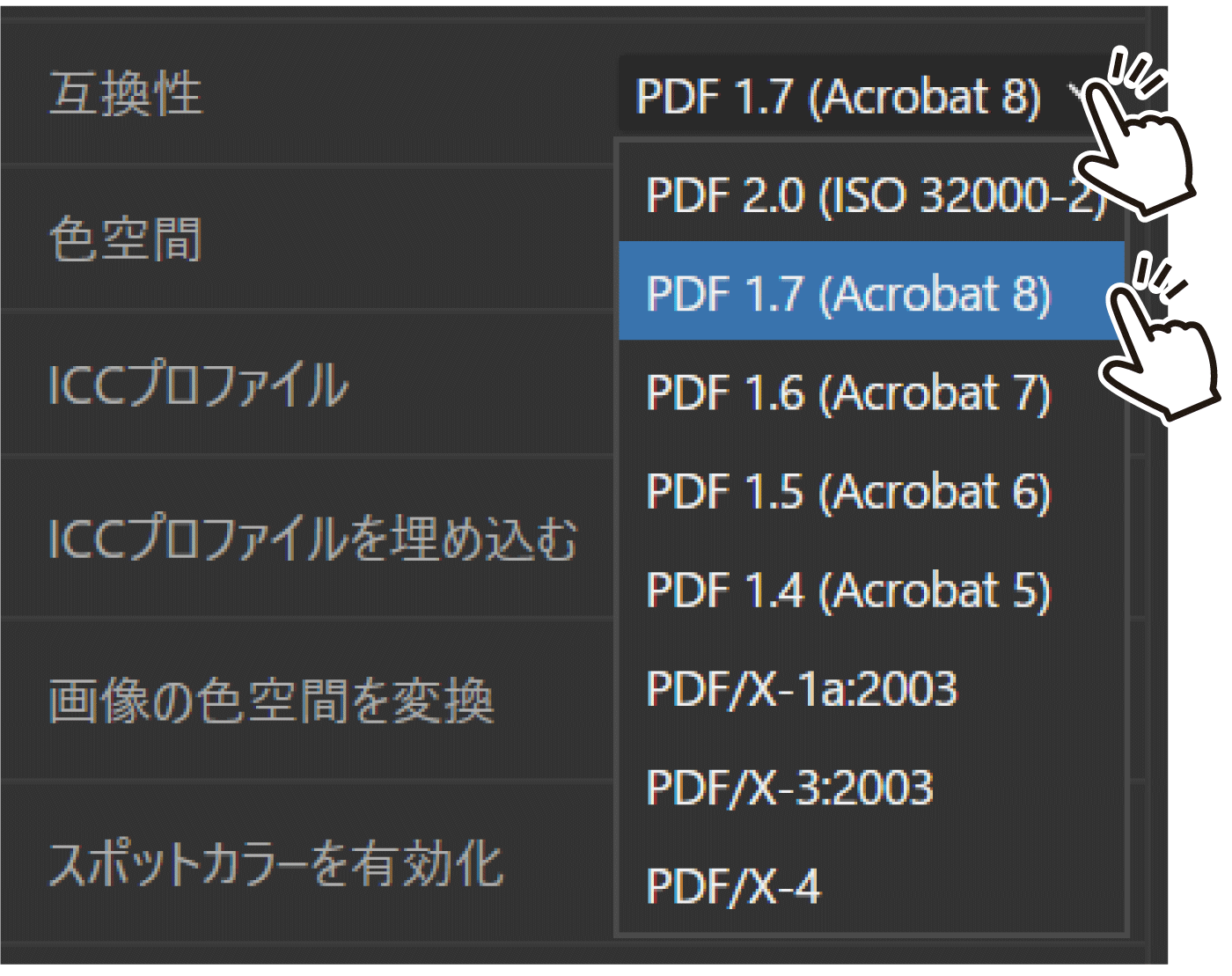 互換性の項目を「PDF 1.7 (Acrobat 8)」に設定してください。