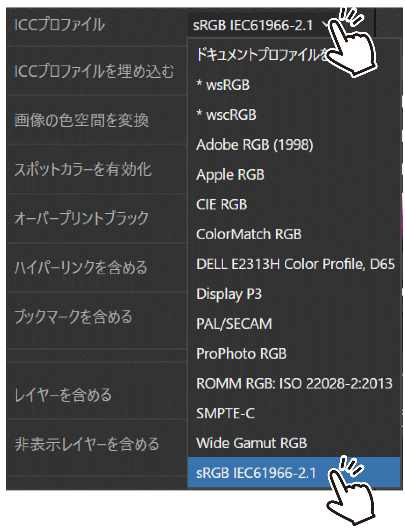ICCプロファイルの項目で「sRGB IEC61966-2.1」 を選択してください。