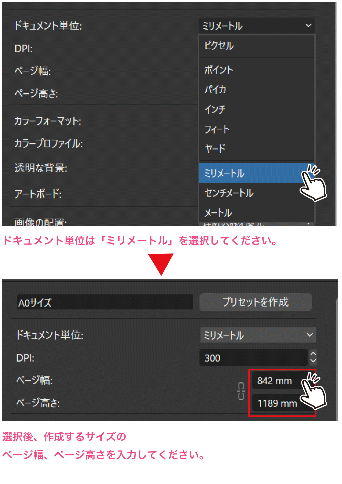 ドキュメント単位で「ミリメートル」を選択した後、