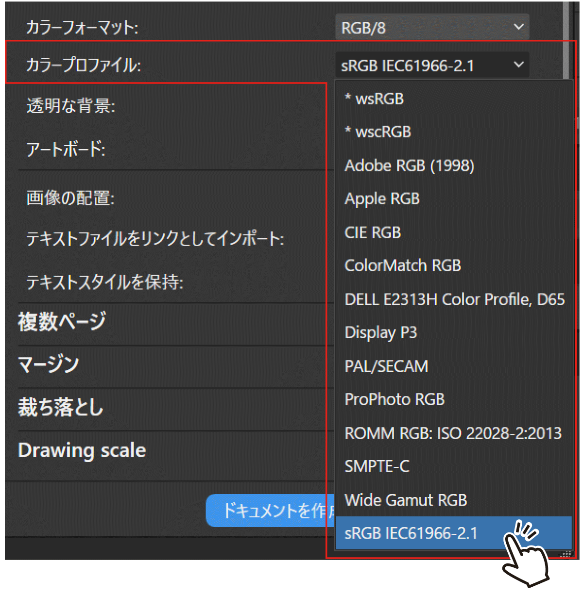 ※ドキュメント作成後にサイズやカラーフォーマットを変更すると、