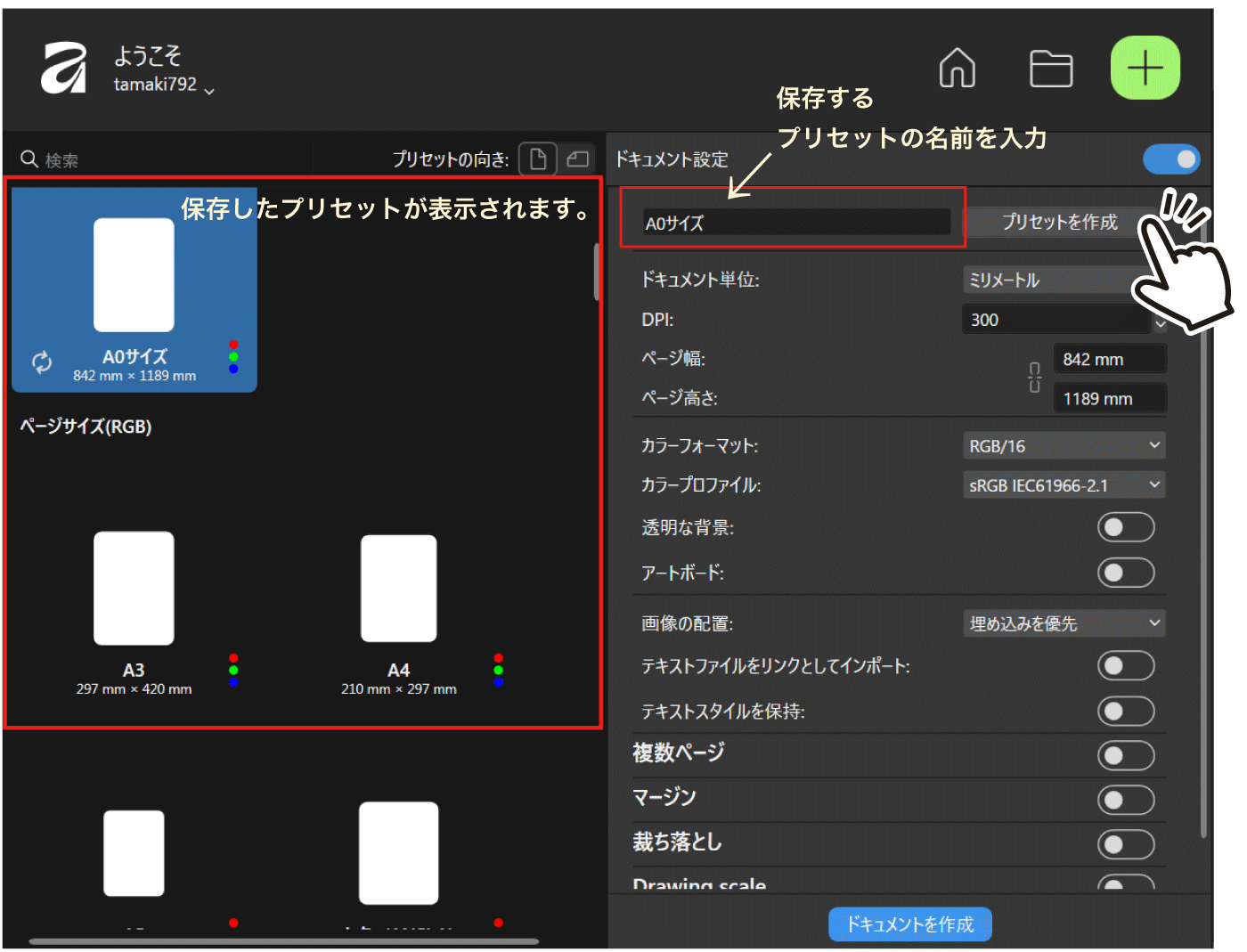 次回以降の新規ドキュメント作成時に登録済みのプリセットをワンクリックで呼び出すことができます。