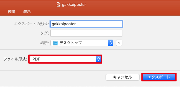 ファイル形式「PDF」を選択後、「エクスポート」を選択します。