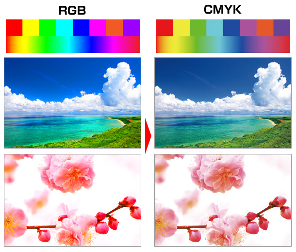そのため、「CMYK」で表現できない「RGB」鮮やか色は近似値に変換されるため、元の色よりくすんだ暗めの色合いとなります。