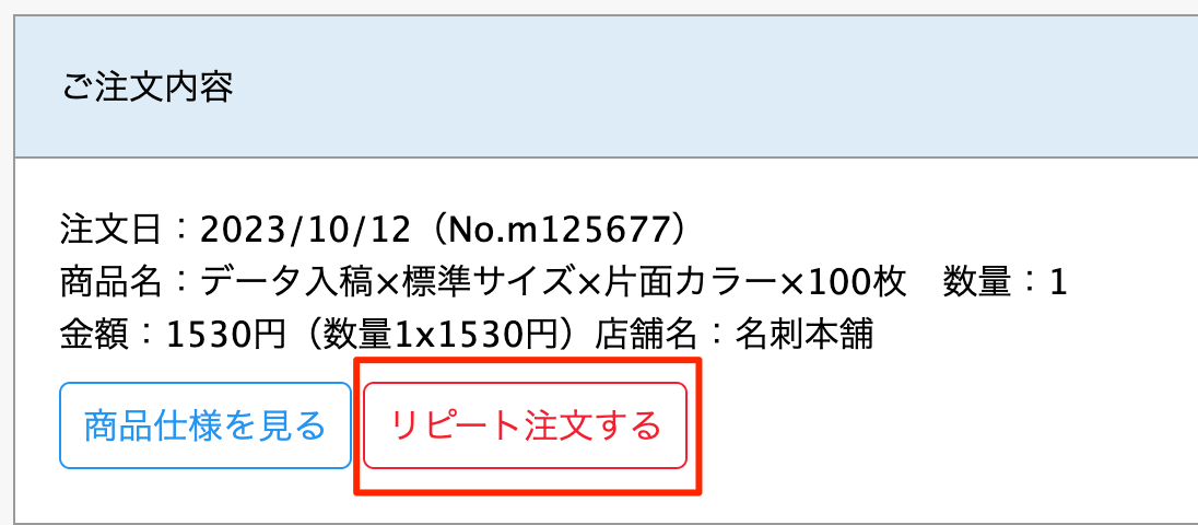 「商品仕様を見る」ボタンをクリックすると、前回のご注文内容を確認できます。