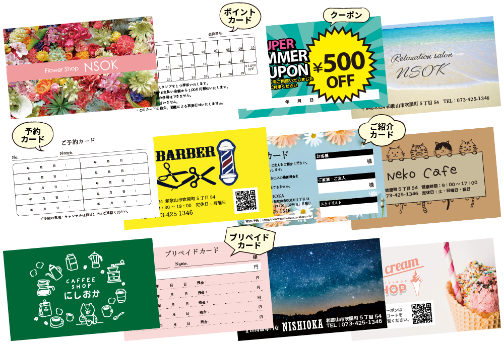 予約カード、ご紹介カード、プリペイドカードなど使用用途に合わせ、